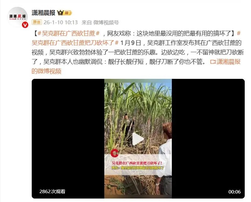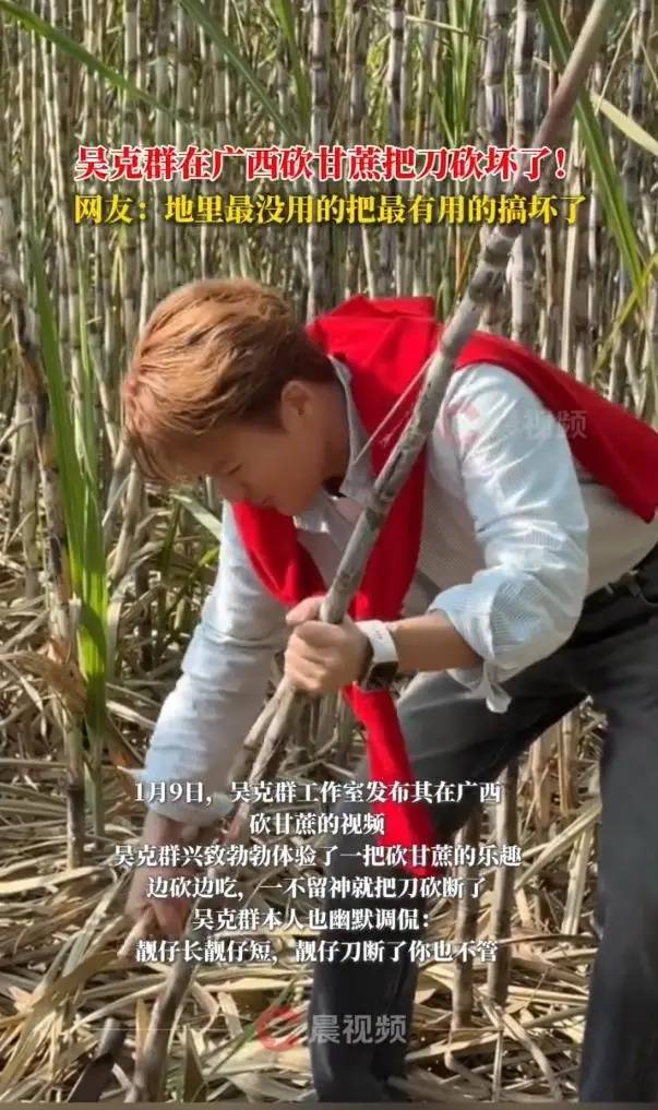 2026年1月9日,吴克群工作室发布了一段他在广西百色体验农活的视频。视频中,他兴致勃勃地挥动镰刀砍甘蔗,还时不时品尝两口,结果用力过度,镰刀当场断裂。面对这既狼狈又搞笑的场景,吴克群十分豁达,幽默自嘲道:“靓仔长靓仔短,靓仔刀断了你也不管。”