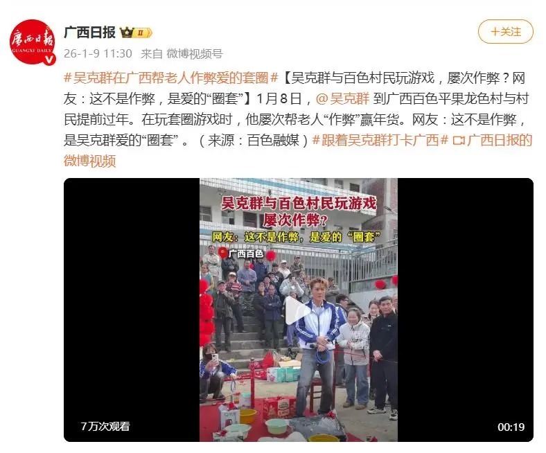 完成“剪橘KPI”后,吴克群又转战平果的甘蔗田,继续体验新农活。从坐拖拉机、穿拖鞋下地(被调侃掌握了广西人精髓),到砍甘蔗时主动向农民请教技巧,失败后憨笑自嘲,全程毫无明星架子,完全融入当地氛围。不仅如此,他还应网友提议,体验了套圈送年货、逛夜市等活动,被总结为“活越接越多”。他这份真诚且接地气的表现,多次获得广西文旅厅点赞。